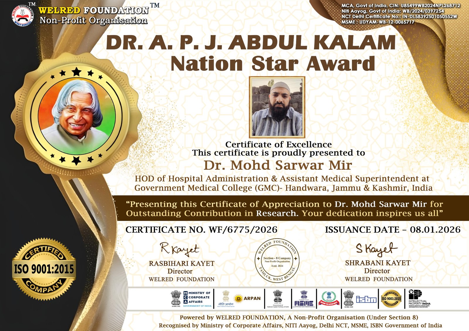 In a moment of pride for the medical fraternity of Jammu and Kashmir, Dr. Mohd Sarwar Mir, Head of Hospital Administration and Assistant Medical Superintendent at Government Medical College (GMC), Handwara, has been conferred the prestigious Dr. A.P.J. Abdul Kalam Nation Star Award.