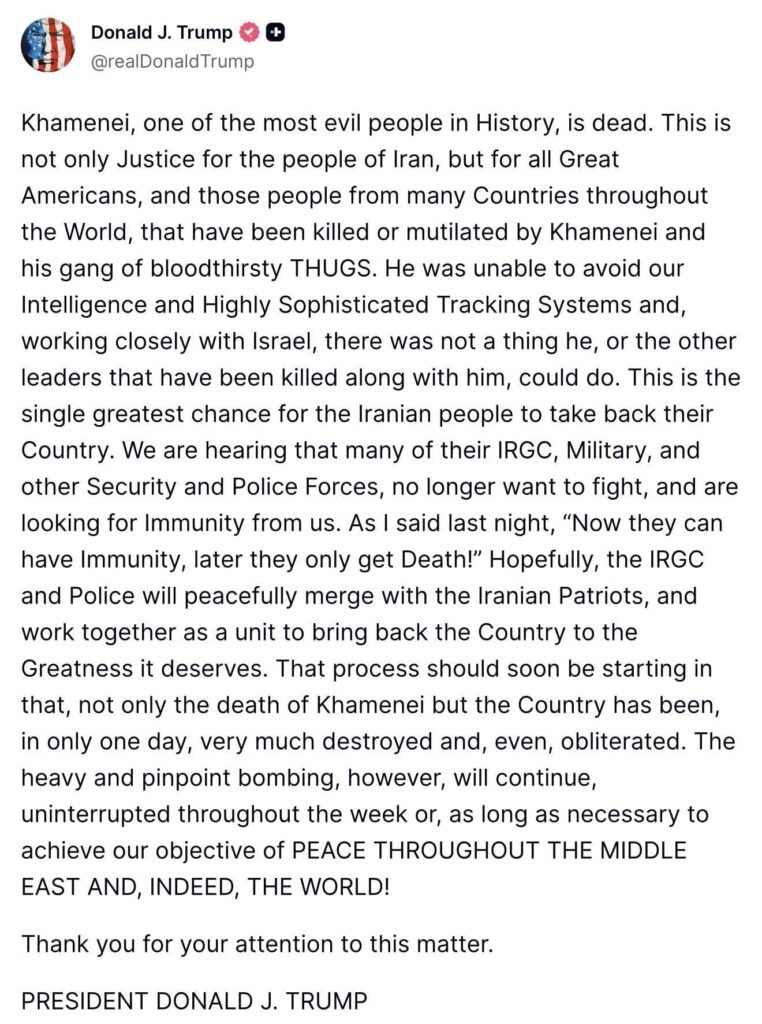 U.S. President Donald Trump announced Khamenei’s death on social media, calling it a historic moment and “justice for the people of Iran and the world.”